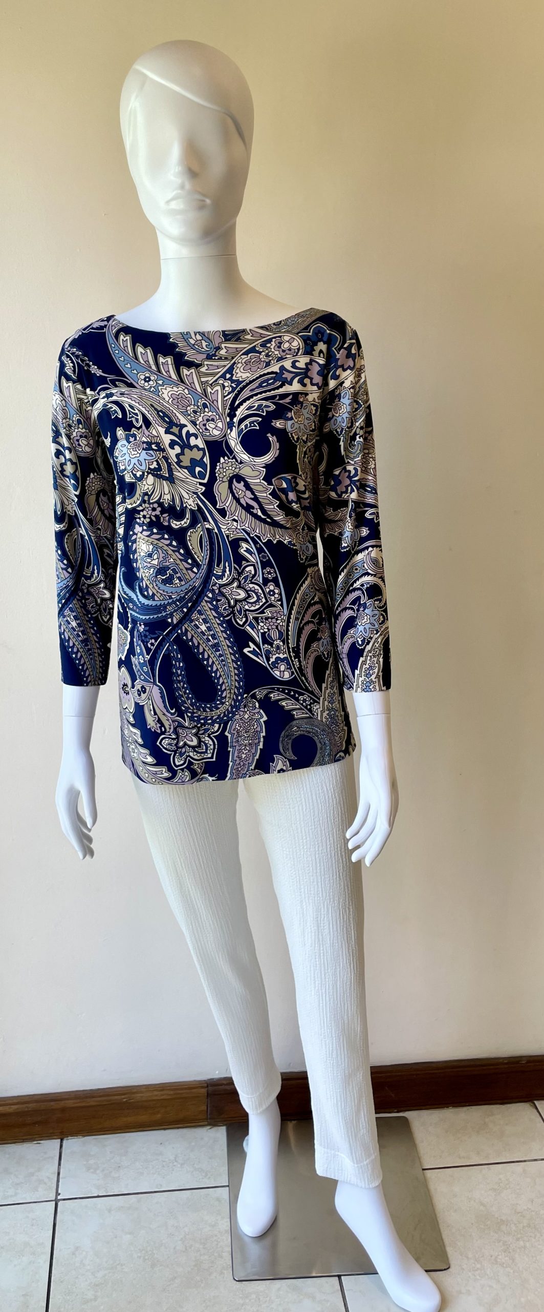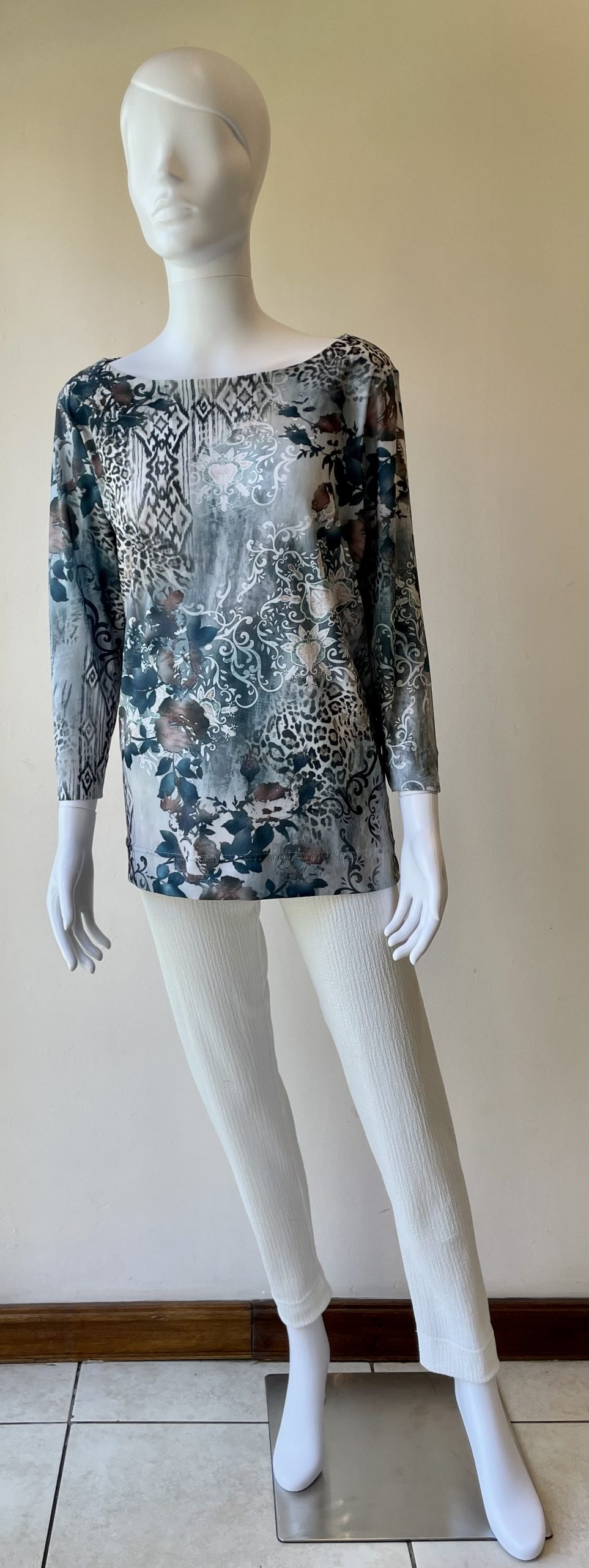 3/4 Sleeve Classic Boatneck Top which comes in a gentle Print with Green Leaves and a touch of animal print or midnight blue background with a paisley print in soft lilac white and pale blue