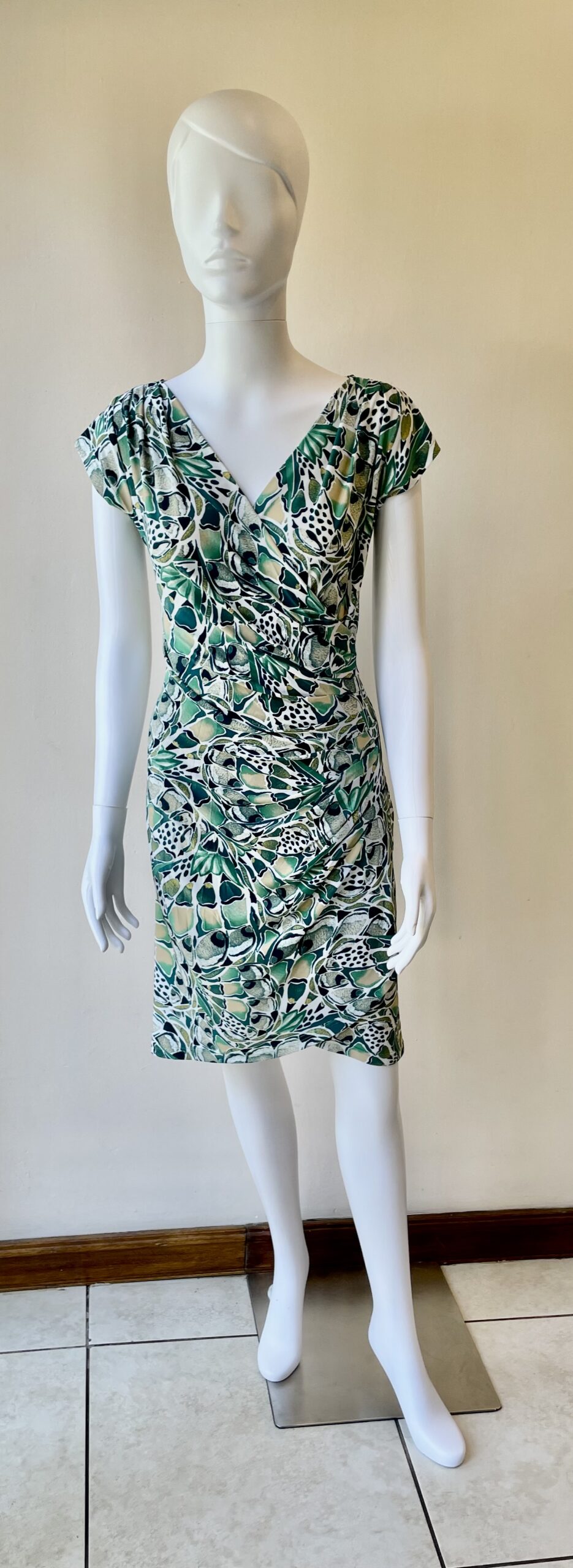 Flattering pleated and draped dress with a crossover front bodice and a Tulip wrap skirt